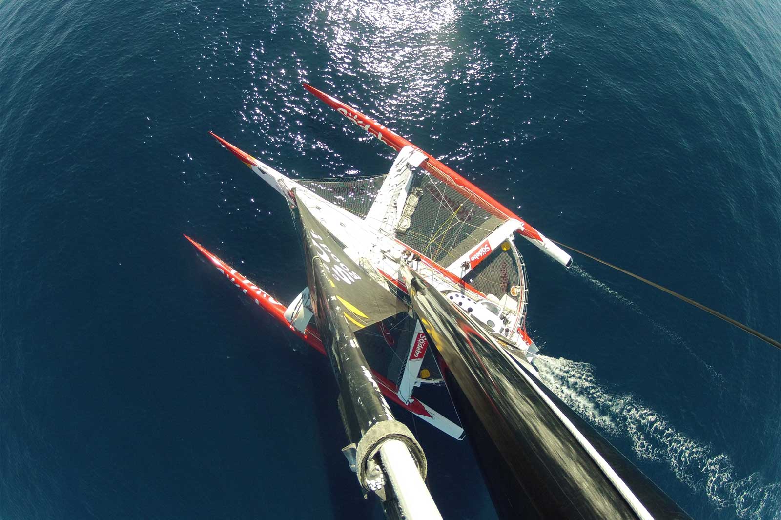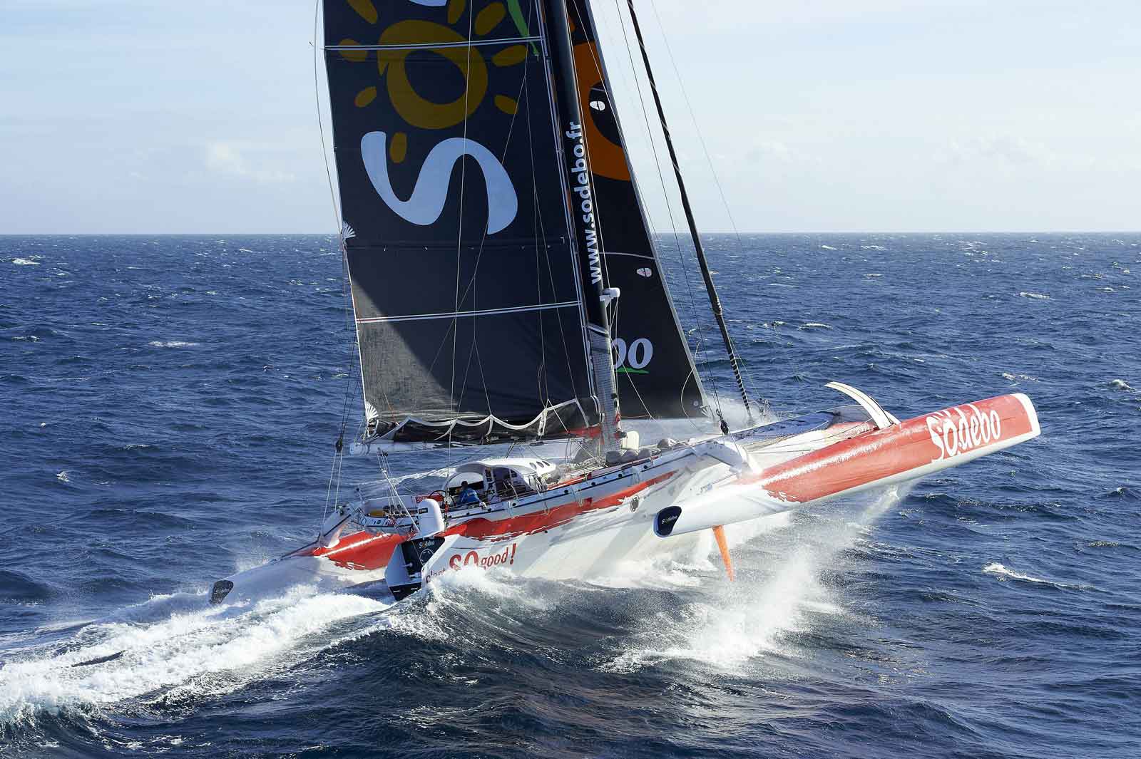The third iteration of the Irens designed solo record breaking round the world maxi trimarans; the 32m (105ft) SODEBO was built in carbon pre-preg at Boatspeed, Australia for Thomas Colville. The characteristic overhanging bow is 2.5m (8ft) longer than Joyon’s IDEC.